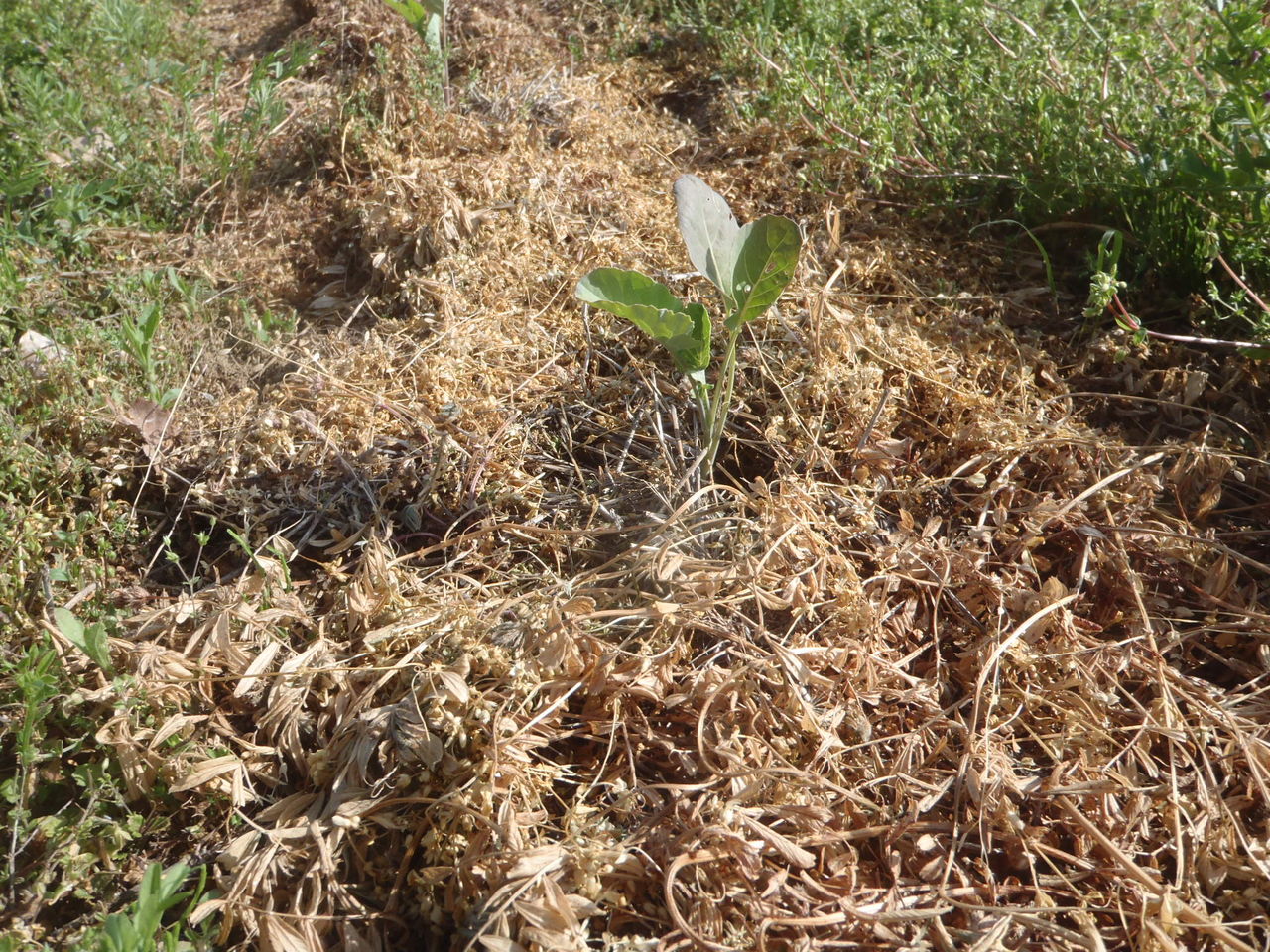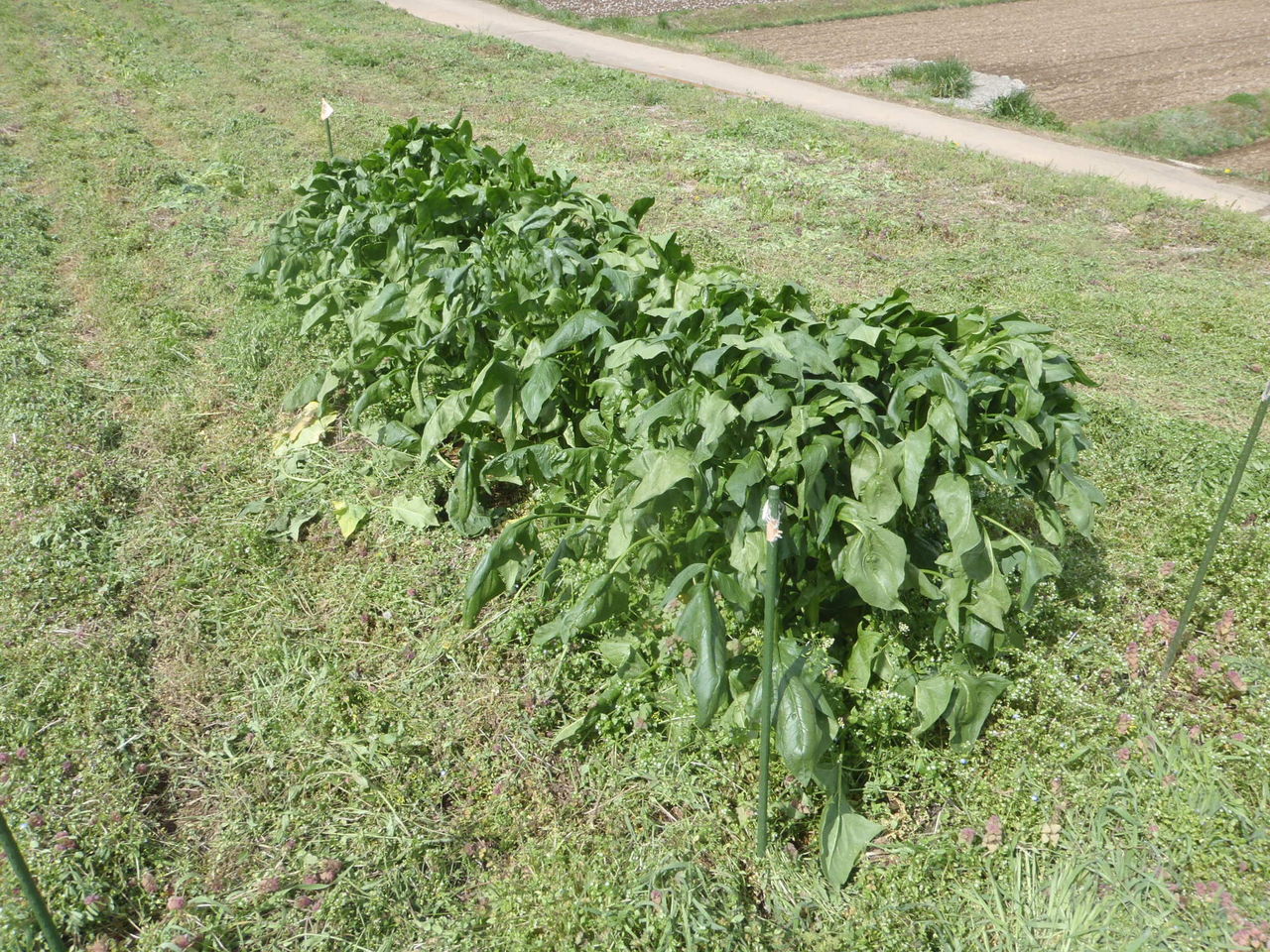 (通路になる部分は刈らない。次年度のカラスノエンドウの種をこぼしてもらおう、という想いと、踏みつけで土が硬くならないように・・・。)
